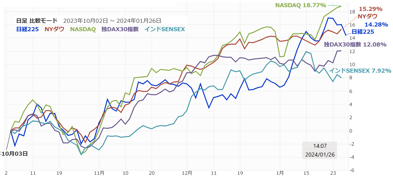 昨年10月以降は各指数とも上昇しており、日米の指数は今月も上昇しています。ただし、1月以降はインドSENSEXが軟調です。独DAX30は1月は軟調なスタートでしたが1月中旬から上昇に転じています。
