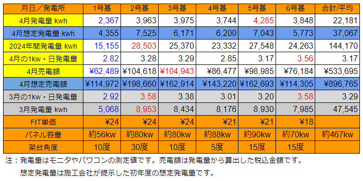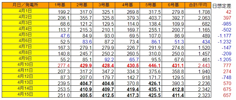 日別に見ると、4/10の2,443kWh(想定比+777kWh)が最大で、最小は4/6の 434kWh(想定比 -1,232kWh)でした。