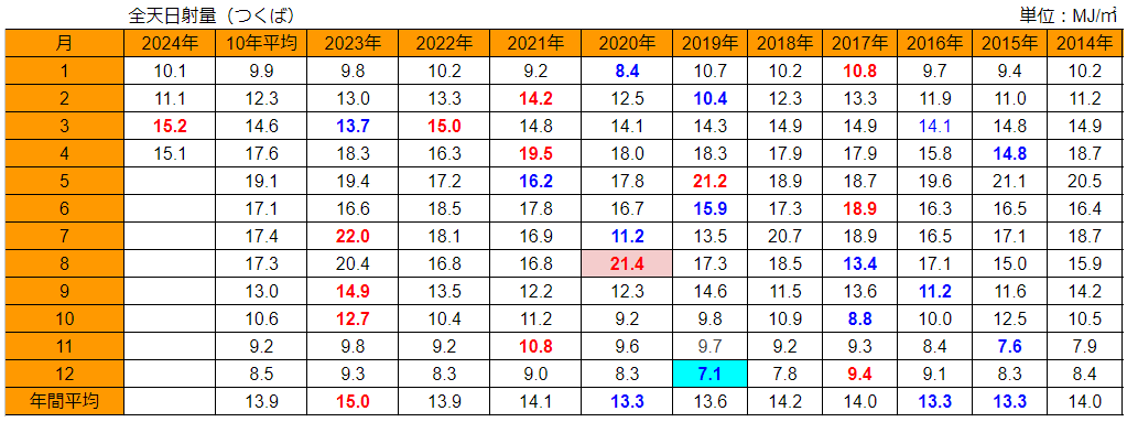 過去10年平均の17.6MJ/㎡を大きく下回り、ワースト2位です。