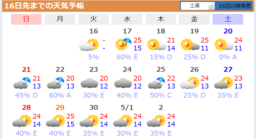 My発電所に近い土浦の天気予報を見ると来週4/21~の天気が良くないようです。天気予報が変わると良いのですが・・・