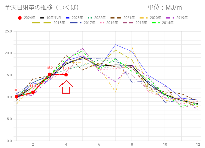 今月前半(4/15迄)の日射量は15.1MJ/㎡で