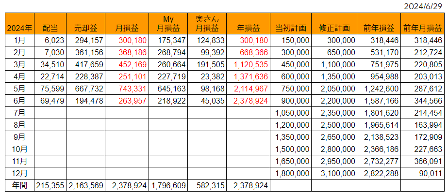 これで今年の年損益(税引前)は +2,378,924円 になりました。