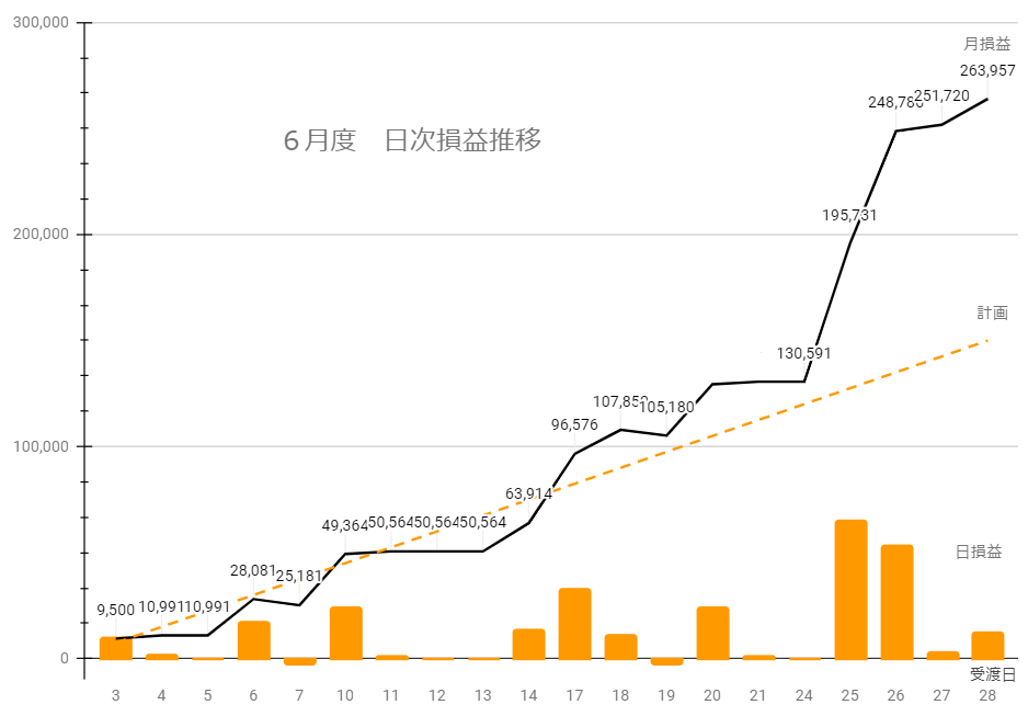 今月の合計確定損益(税引前)は、計画超過の +263,957円 になりました。(^^♪