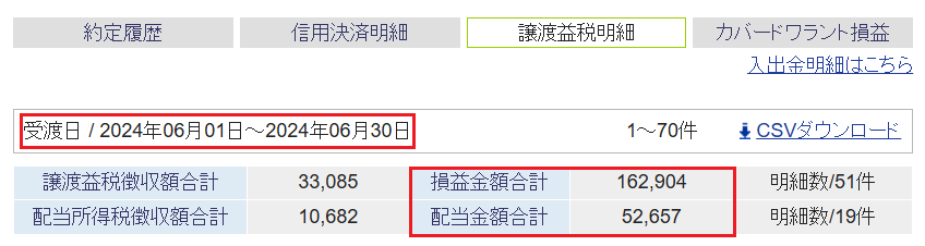 奥さんも前回6/25以降の取引はなく、今月の特定口座の確定損益(税引前)は +42,161円 で