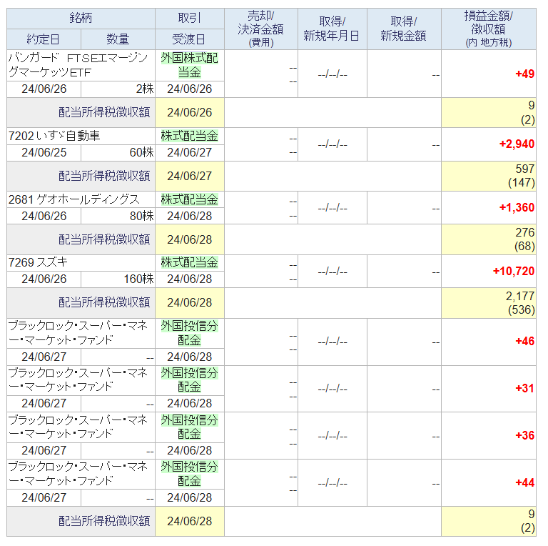 前回記事6/25以降今月分の株売却はありませんが、FTSEエマージングマーケッツETF、いすゞ自動車、ゲオホールディングスとスズキから配当が入りました。また、スーパーMMFから分配金が入りました。