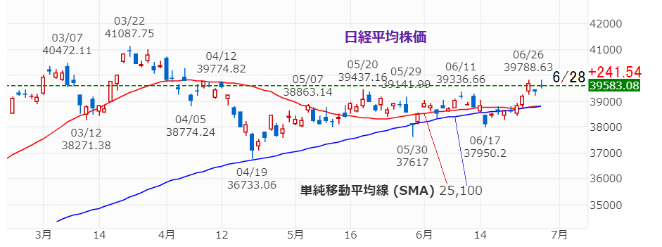 昨日6/28の日経平均は 241.54円高 の 39,583.08円 で引けました。