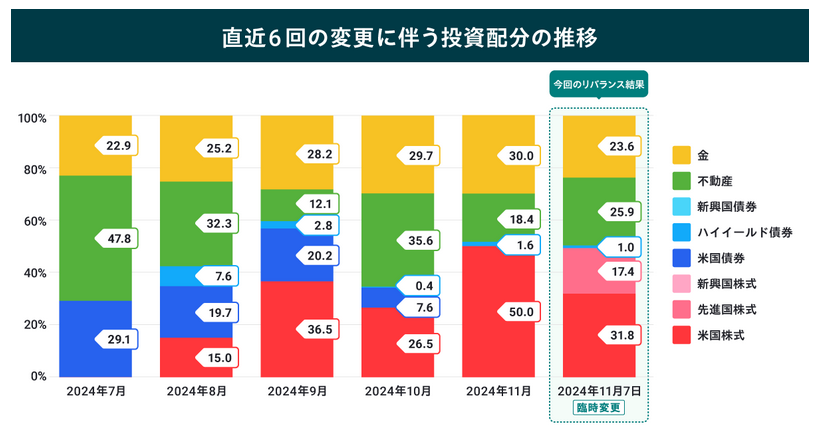 ROBOPROにおける臨時リバランスは、複数のマーケットデータから市場が変動の高い局面に入ったと定量的に判断される場合に実施されます。米大統領選の結果を受けて、株式や不動産等の比較的リスクが高い資産の中でも上昇と下落の方向感が入り混じる展開となったと同時に、一般的に安全資産とされる金が大きく下落しました。2024年8月の株式市場の下落時は通常の調整の範囲内と判断されたものと思われますが、今回は金が相対的に大きく下落したこと等も通常時とは異なる局面であるとの判断に影響し、臨時リバランスが発動したものと考えられます。