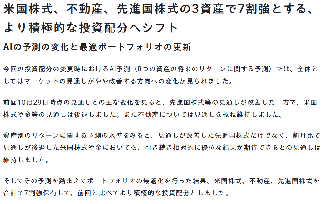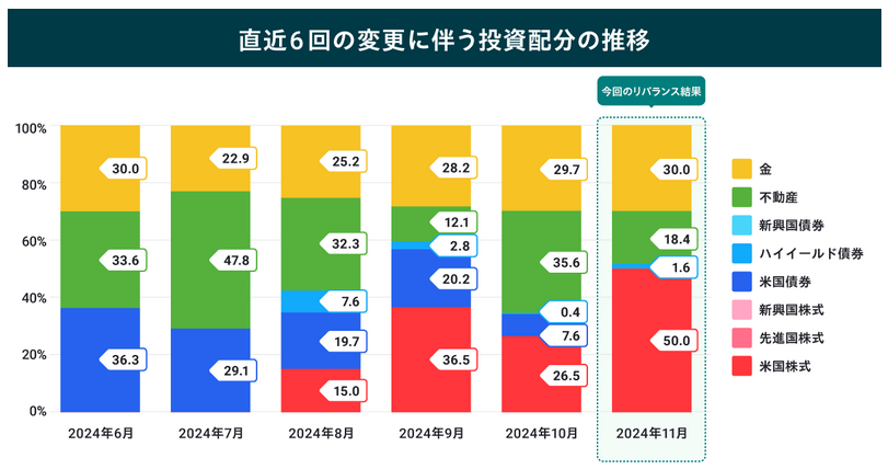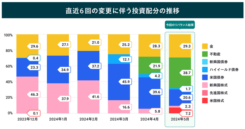 米国株式が減少して先進国株式が追加、金がやや減少し不動産が増加しています。
