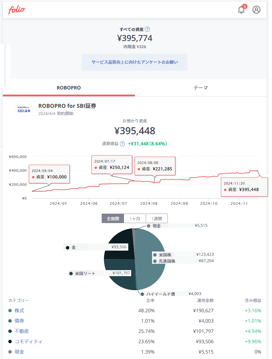 今年4月、AIで金融市場を先読みしダイナミックに投資先を変更するロボプロ folio を知り毎月積立(月3.3万円)を始めました。