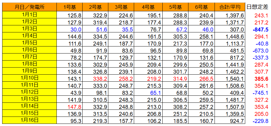 日別に見ると、1/10の1,540.1kWh(想定比+385.6kWh)が最大で、最小は1/3の 307kWh(想定比 -847.5kWh)でした。