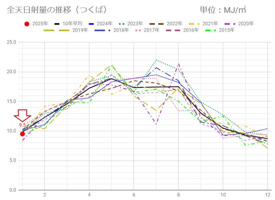 今月前半(1/16迄)の つくば の日射量は 9.5MJ/㎡で、昨年1月の10.1MJ/㎡や過去10年平均の9.9MJ/㎡を下回っています。ちょっと微妙な感じです。