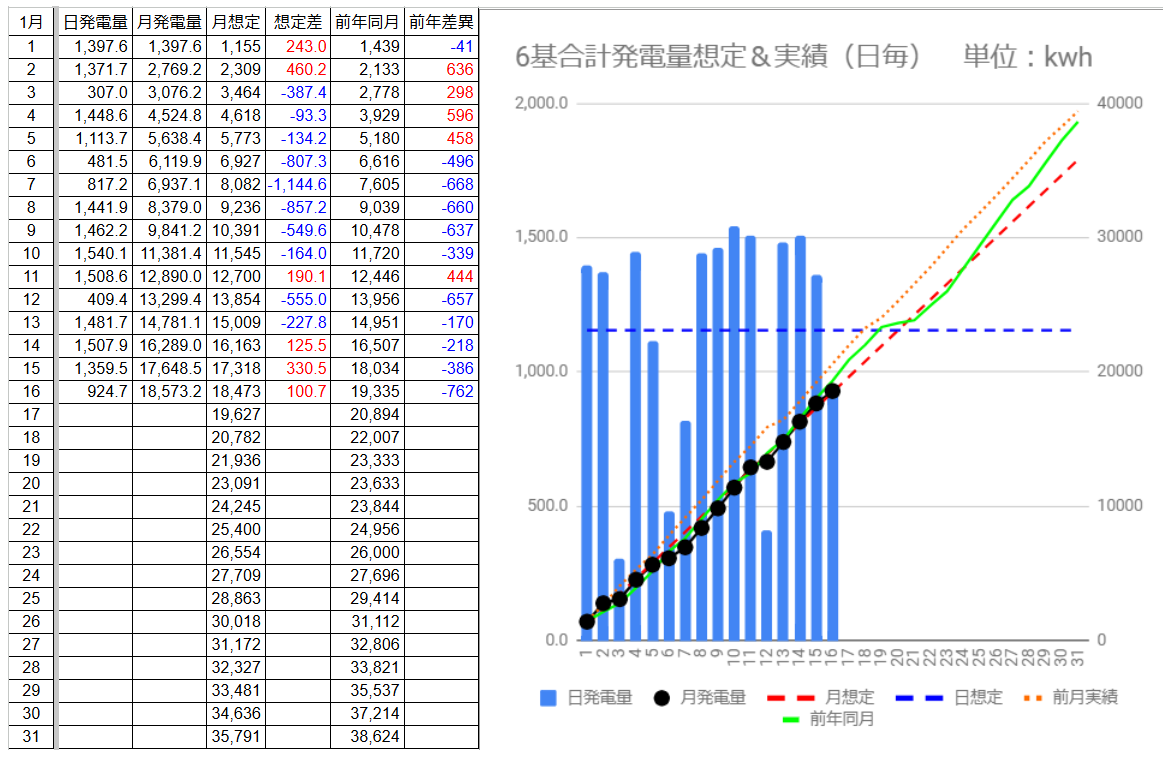 今月前半(1/16迄)の発電量は18,573.2kWhで想定を +100.7kWh 上回りましたが、昨年1月と比べると 762kWh 下回っています。