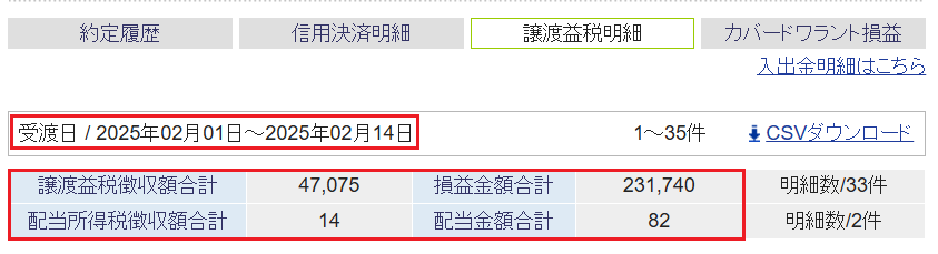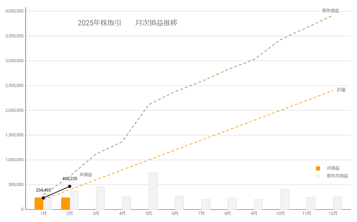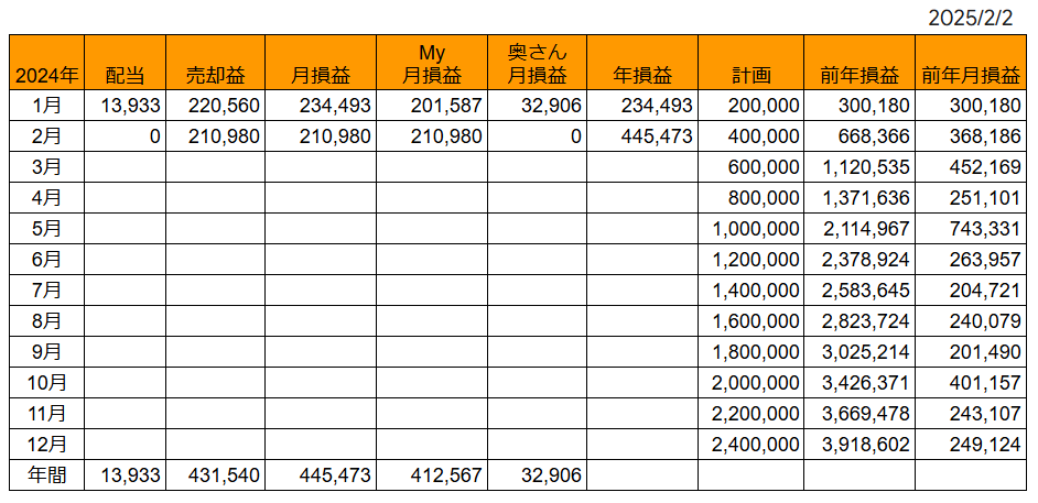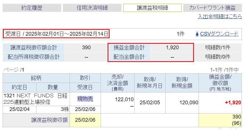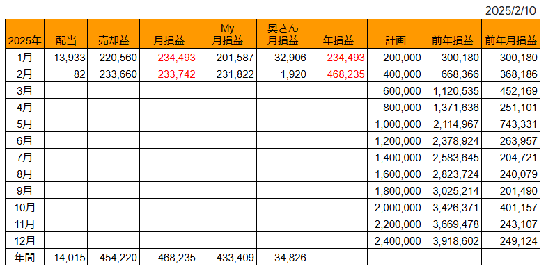 奥さんは2/4に日経225連動型上場投信を売却し今月の確定損益は+1,920円です。