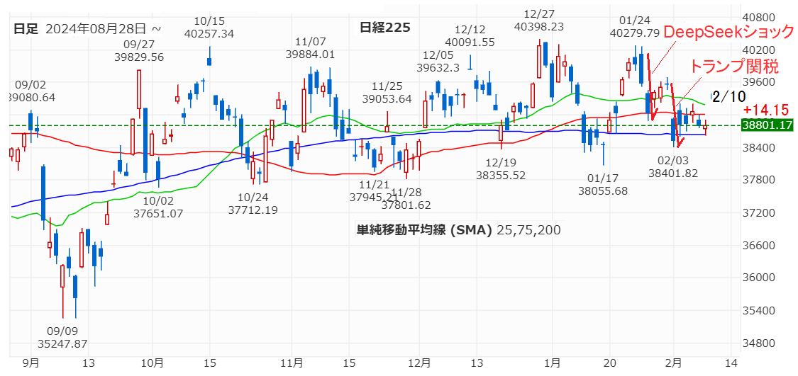 日経平均はDeepSeekショックとトランプ関税(メキシコ、カナダ)による影響を受けてレンジ相場の下限に近づいているところで2/7Friの米国株が3指数とも下落、また、米ドル/円が週末151円台に突入していましたので、