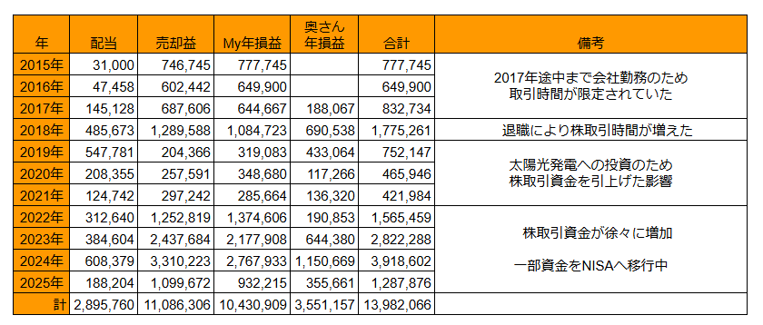 記録を付けている2015年以降の確定損益は累計で+1,398万円になりました。(^^♪