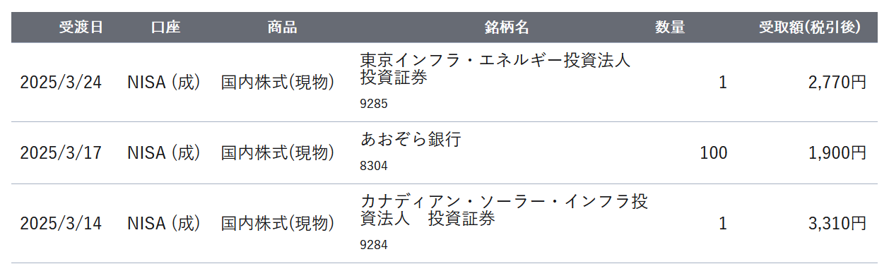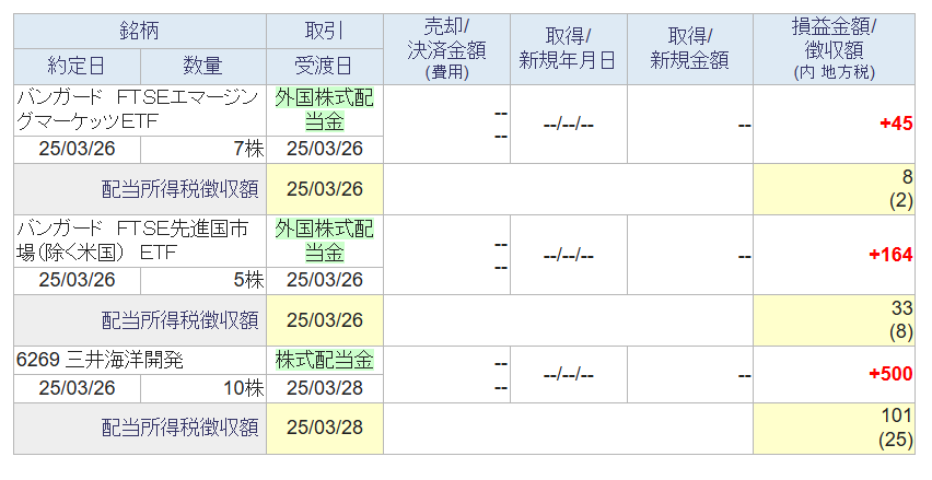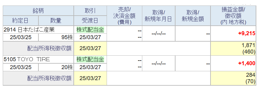 奥さんは3/27にJTとTOYO TIREから配当が入り