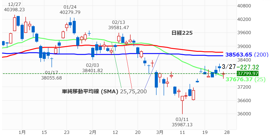 今日3/27は3月末決算企業の配当権利確定日ですが、自動車関税や米国半導体株下落の影響もあり日経平均は 227.32円安の37,799.97円で引けました。