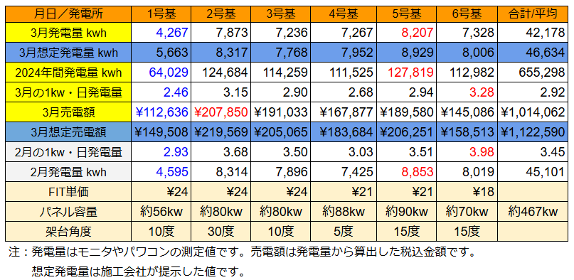注:各発電所の最大発電量は太字、最小は青字で400kWh/日 以上は赤字です。