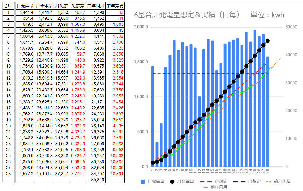 28日間しかなかった2月の45,101.5kWhと比べても 2,924kWh も少ないです・・・(^_^;)