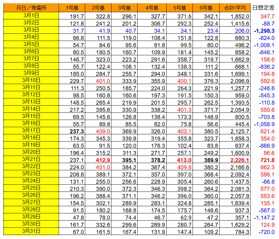 発電量を日別に見ると、3/21の2,226.1kWh(想定比+721.8kWh)が最大で、最小は3/3の 206.0kWh(想定比 -1,298.3kWh)でした。
