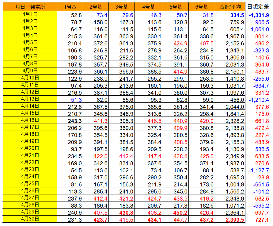 発電量を日別に見ると、4/30の発電量2,393.5kWh(想定比+727.1kWh)が最大で、最小は4/1の 334.5kWh(想定比 -1,331.9kWh)でした。