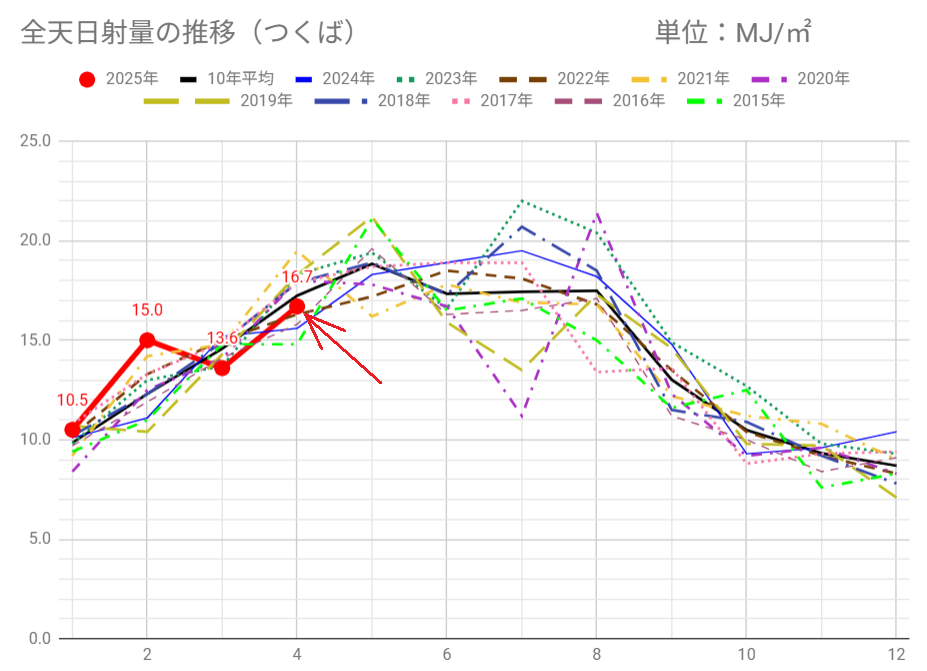日射量は16.7MJ/㎡で過去10年平均の17.2MJ/㎡を下回りましたが、昨年の15.6MJ/㎡は超えました。