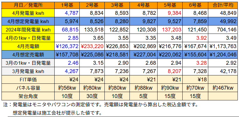 4/1~3の天気が悪く今月はスタートで大きく躓いたものの中旬過ぎからやや回復しました。それでも発電量は48,848kWhに留まり想定を1,143kWh(-2.3%)下回りました。(^_^;)