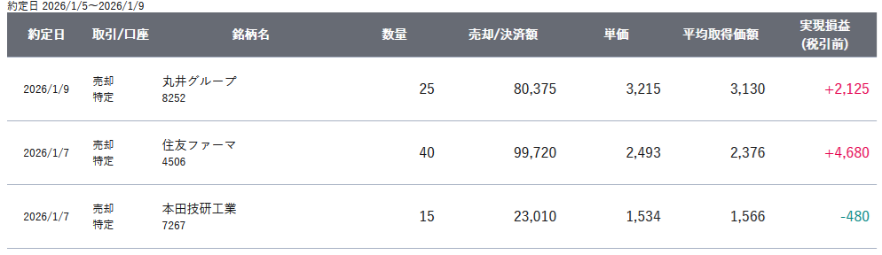 奥さんも1/7に本田技研を売却し住友ファーマと丸井グル-プを利確しました。