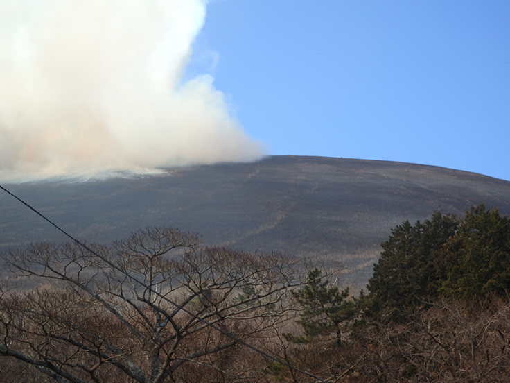 午前9時過ぎからお鉢焼き(噴火口内側の山焼き)が行われ、12時に大室山の山焼きが始まります。