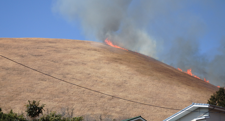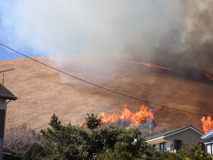 大室山のふもと、下の写真に写る家のすぐ裏側からも炎が拡がっています。