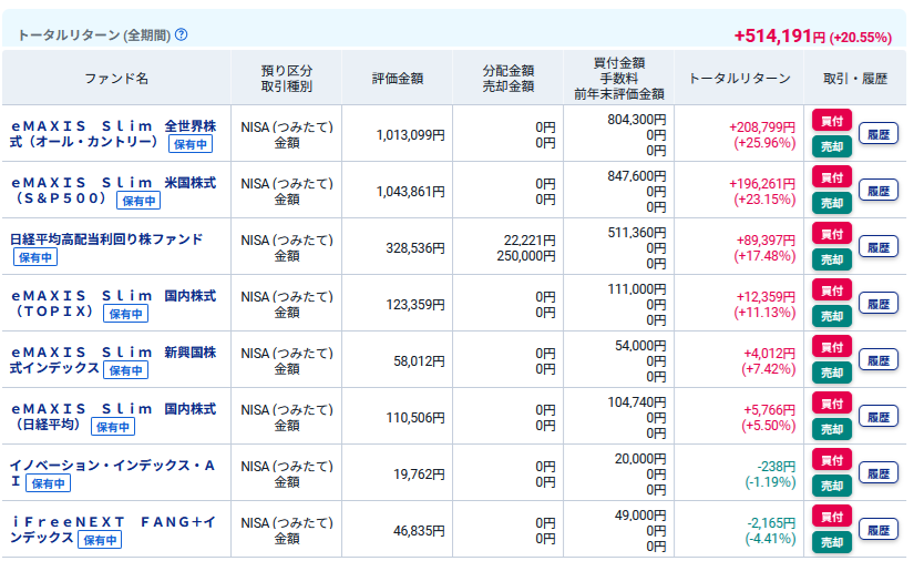 合計のトータルリターンは+4.67%で、ベンチマークとする日経平均は+7.76%、オルカンは+0.94%です。