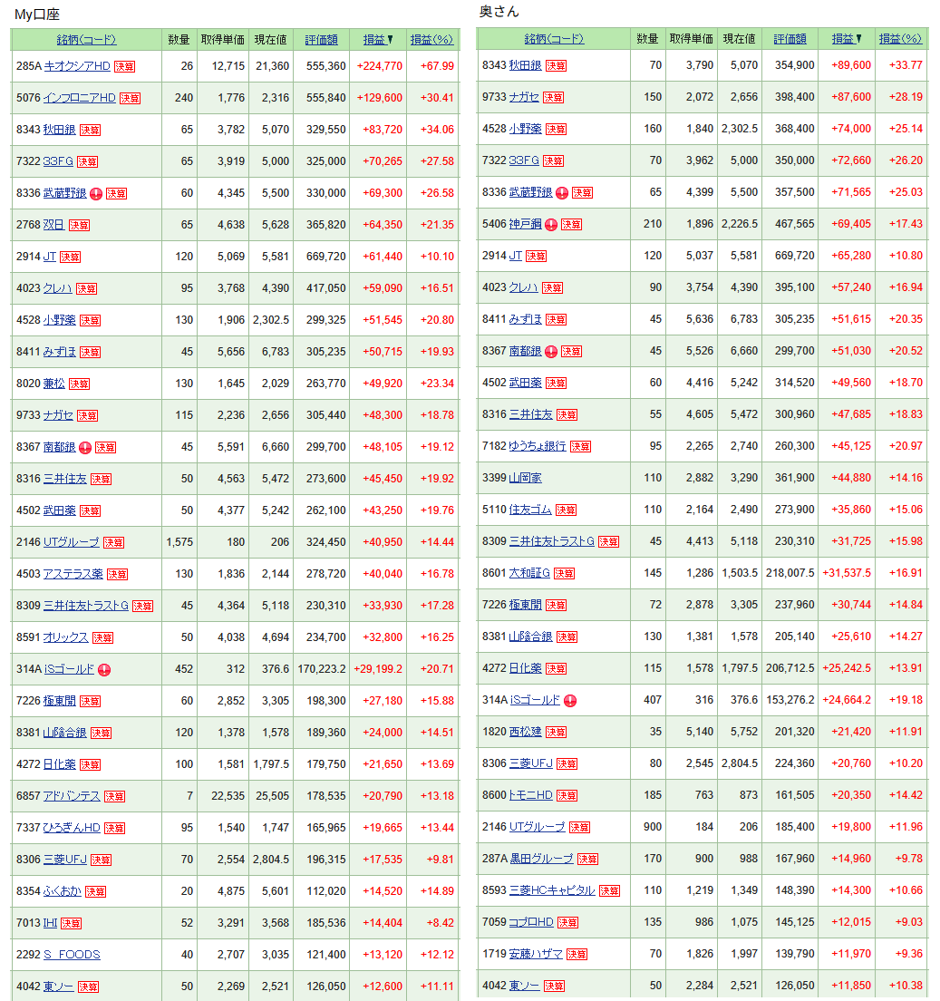 保有銘柄の各TOP30です(評価損益順)。