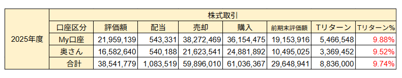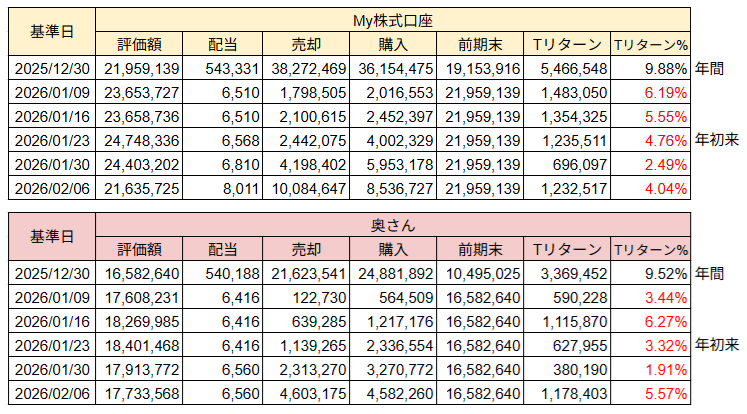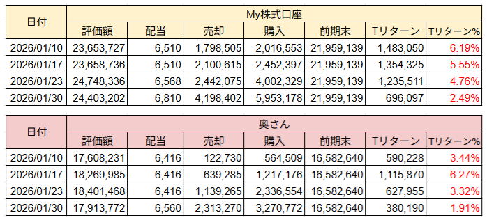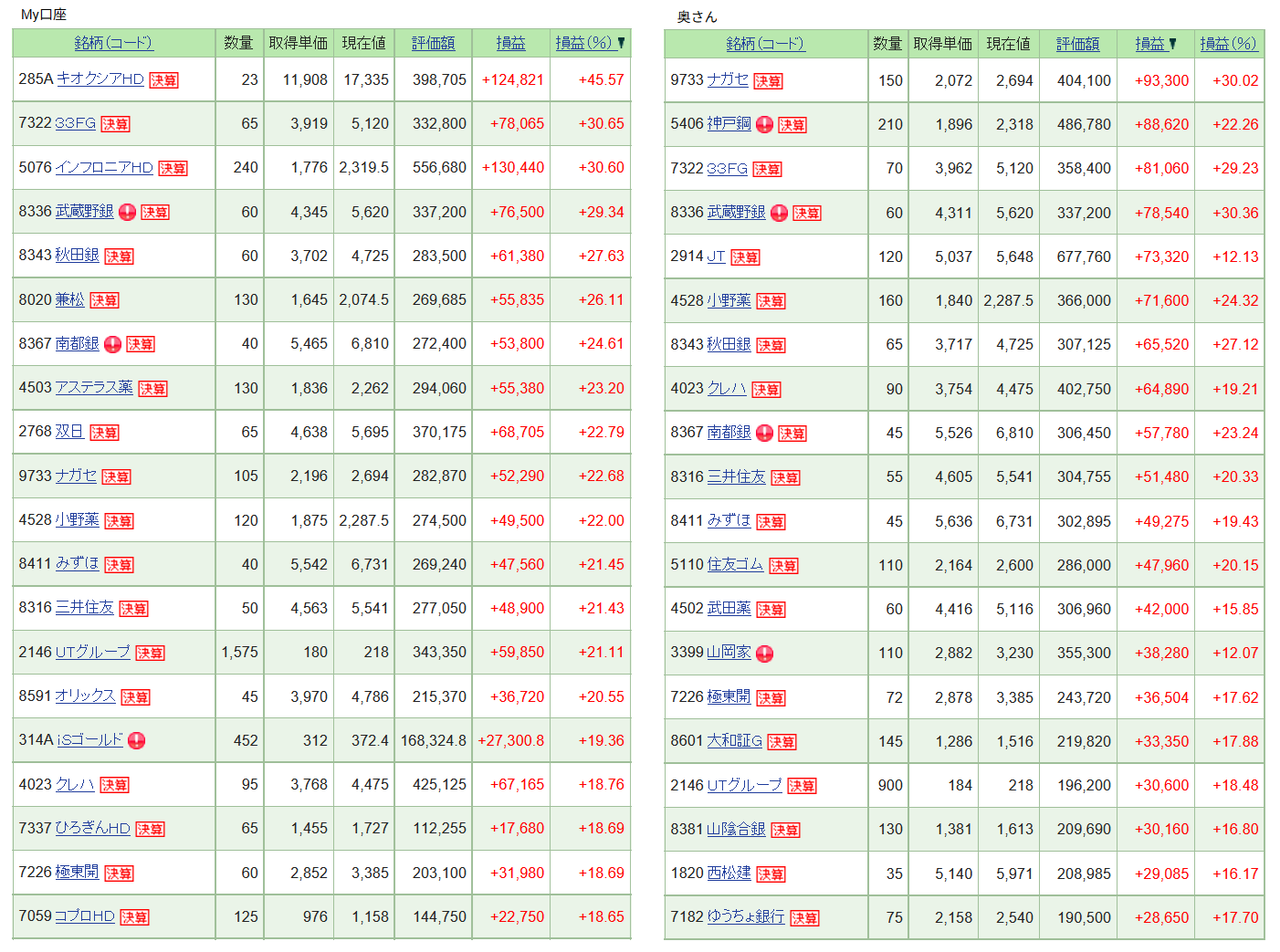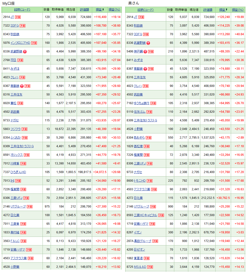 My口座は、まだ保有銘柄の再構成を行っている最中です。奥さんの方はほぼ再構成を完了した効果かトータルリターン%でMy口座を逆転しました。