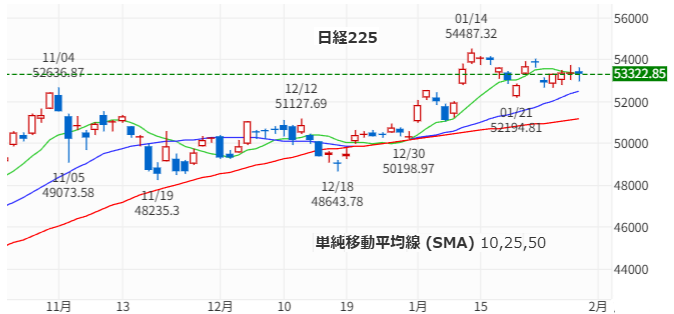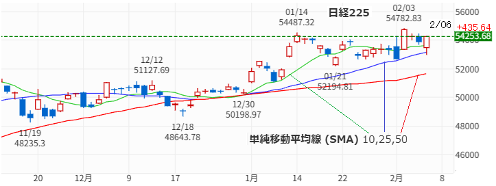 今週の日経平均は2/3に最高値を更新した後、2日続けて下落し2/6金も25日移動平均を下回る水準で寄り付きましたがその後は上昇に転じ 435.64円高の54253.68円で引けました。