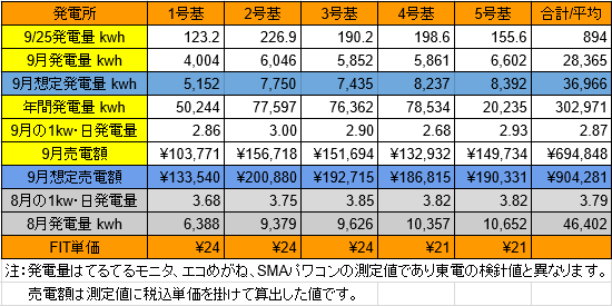 昨日は久々の好天で5基合計の発電量は1,339kwhでした。1kw・日当たりの発電量は2.48から2.68kwhにアップしました。