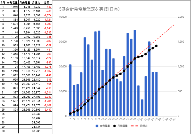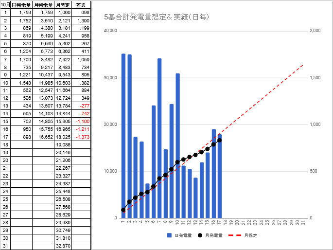 10/18迄の月発電量は17,993kwhで、想定発電量との差異は-1,371kwhから-1,092kwhに縮小しました。