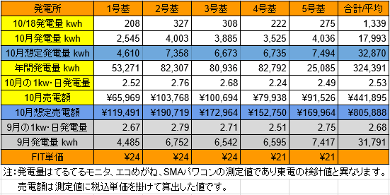 それでは、昨日10/18迄の発電量です。(各発電所の仕様はこちらです)