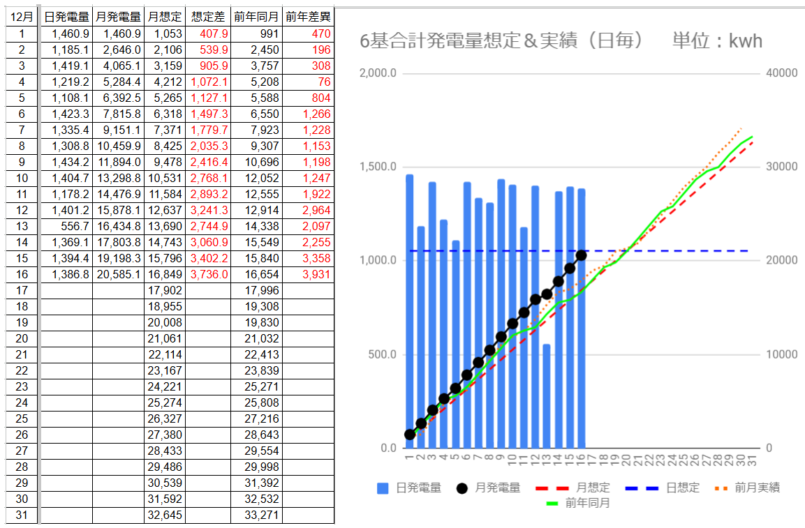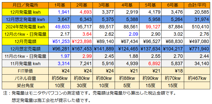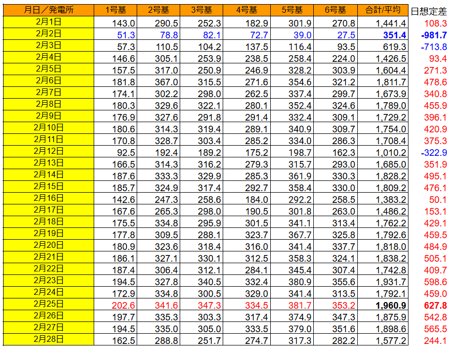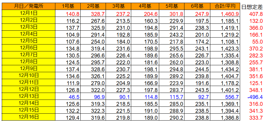 注:各発電所の最大発電量は太字、最小は青字で400kWh/日 以上は赤字です。
