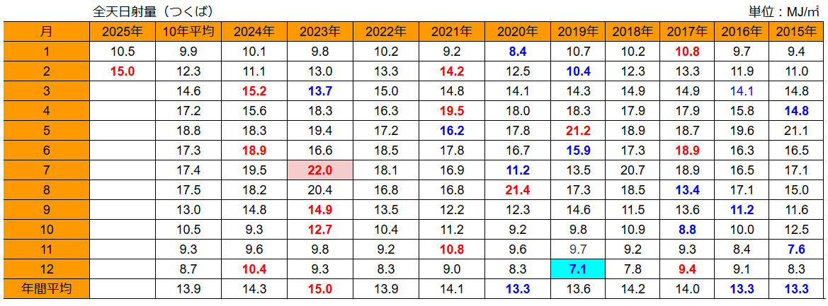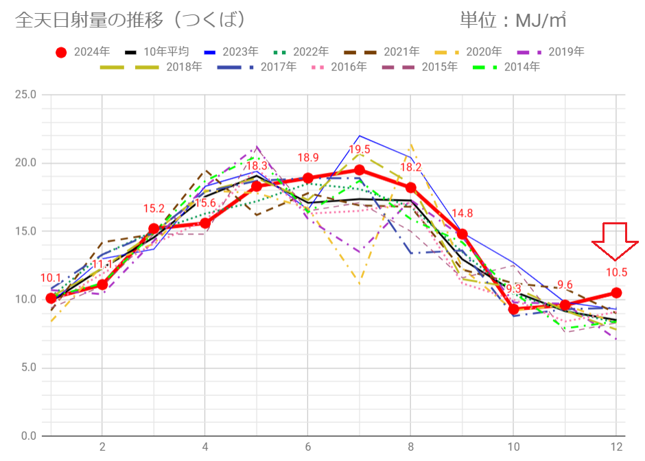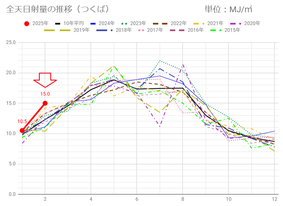 あ~~、日射量13.6MJ/㎡で3月は過去10年でワーストです (^_^;)