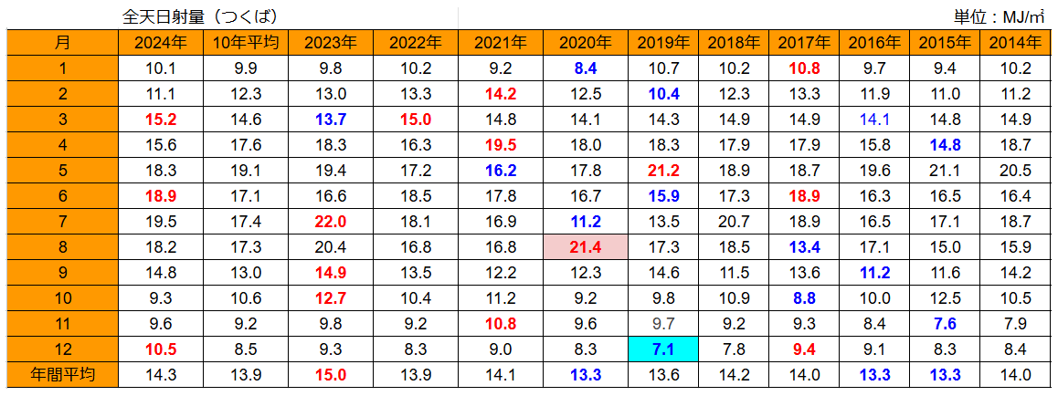 2月は過去10年でトップの日射量15.0MJ/㎡を記録し太陽光発電量も想定を21%も上回りましたが、3月はどうでしょうか?