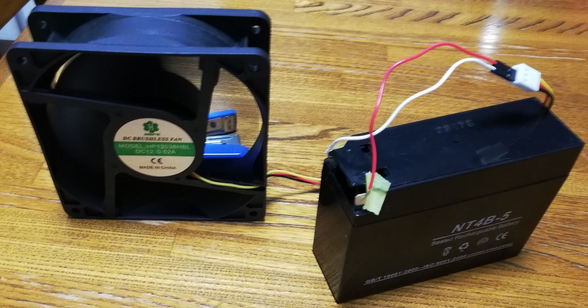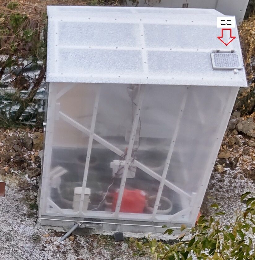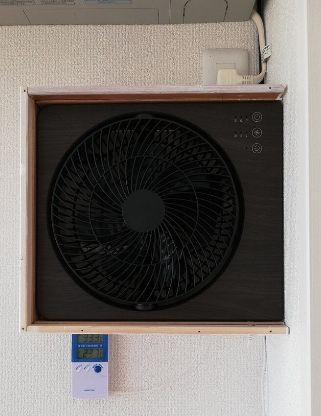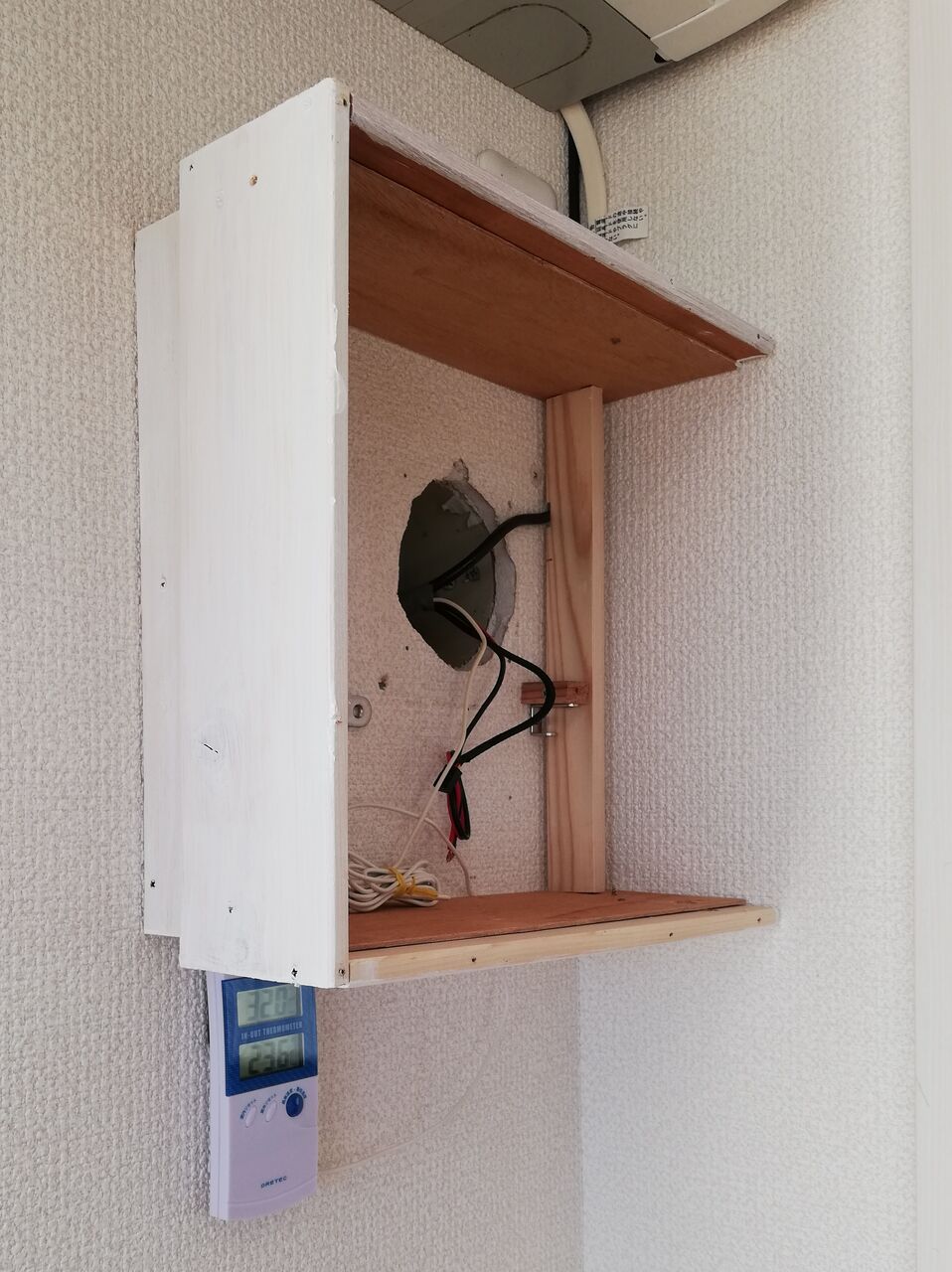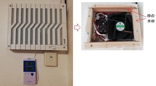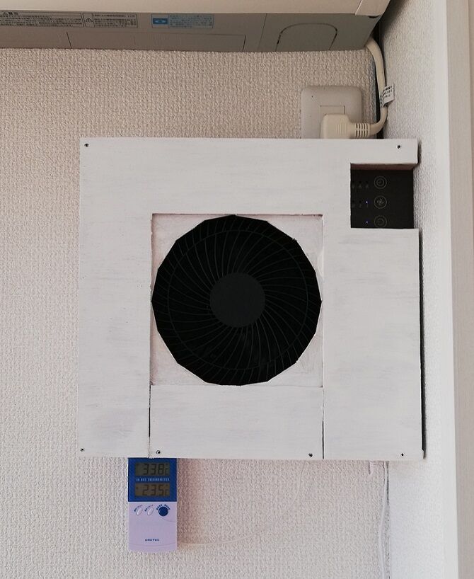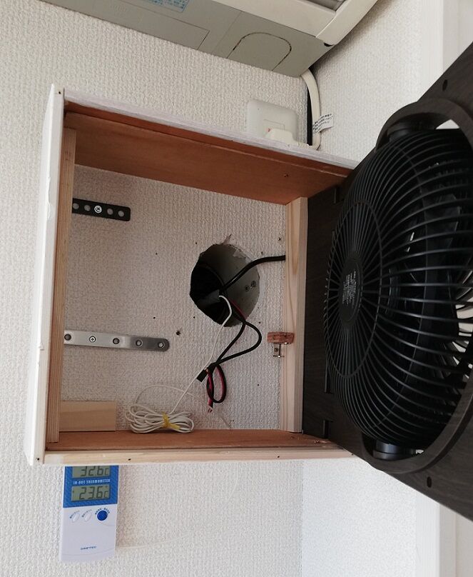 早速、作成にかかりました。外箱はコンパネ(主にコンクリートの型枠に使われます)です。左上のファンはタワー型PC用のファンです。真ん中下の黒いネットは外気取入口です。