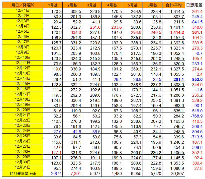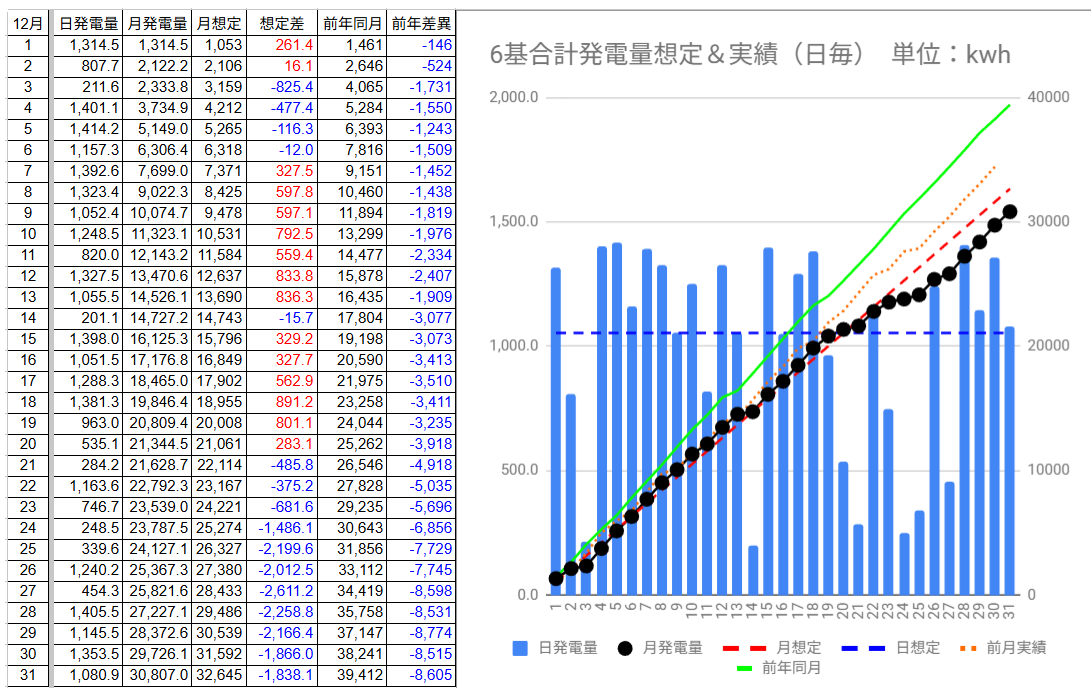 やはり発電量は12/18に想定比+891.2kWhで12月のピークを付けると12/21に想定比マイナスに転落し結局、想定比-1,838.1kWhの30,807kWhに留まりました。(^_^;)