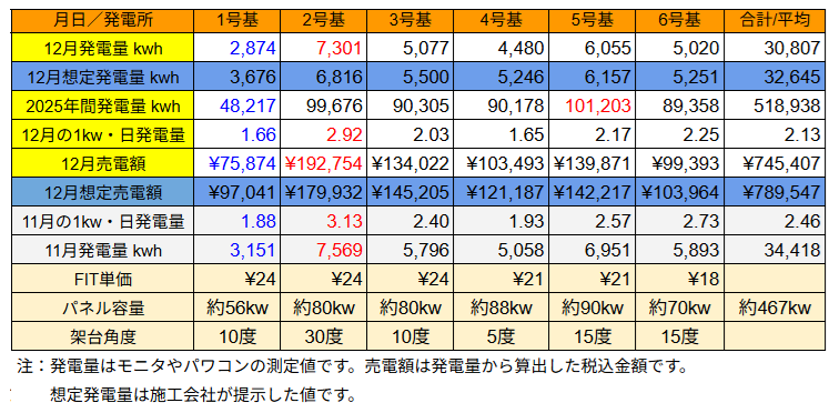 それでは、12月と2025年間の発電量を確認します。昨年12月は初旬に好天が続いたものの中旬から下旬にかけては曇天が多かったように思います。発電量はどうだったでしょうか。