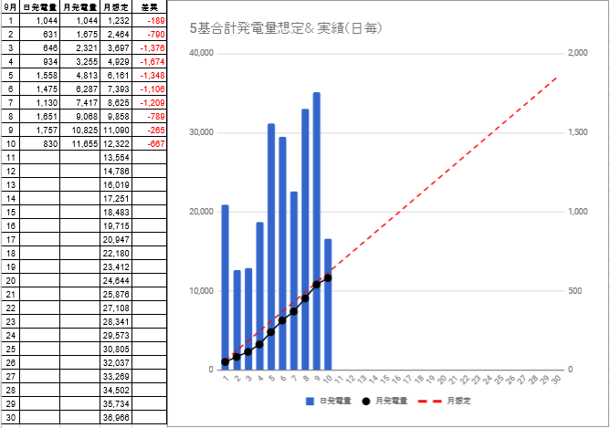 9/10迄の発電量は、11,655kwhで想定発電量との差異は、-265kwhから-667kwhに拡大しました。明日9/11も曇りの予報ですが、少し晴れ間がのぞくことを期待したいと思います。