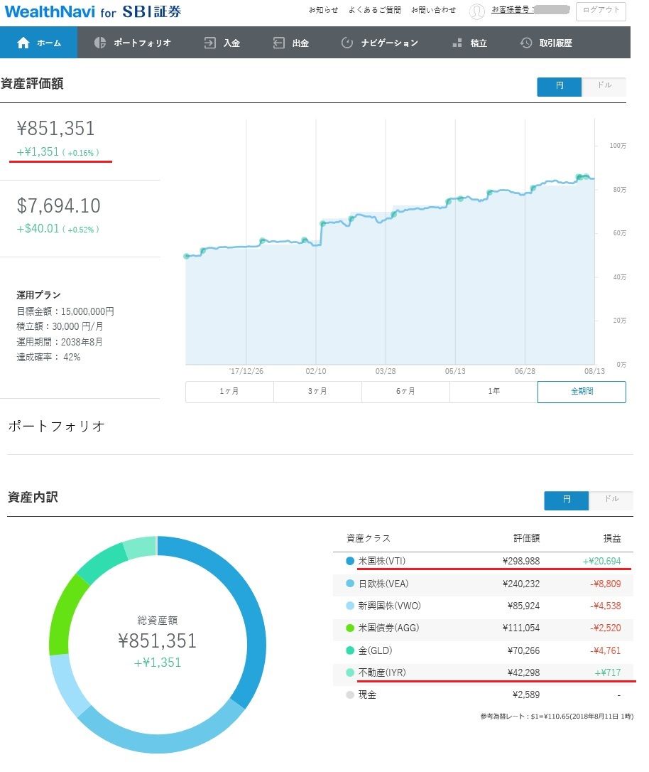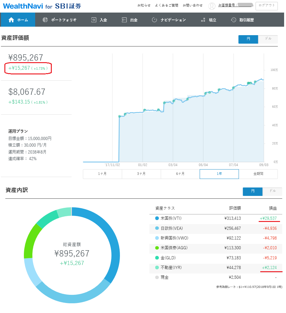 ロボアドバイザー(自動運用サービス)WealthNaviの状況です。