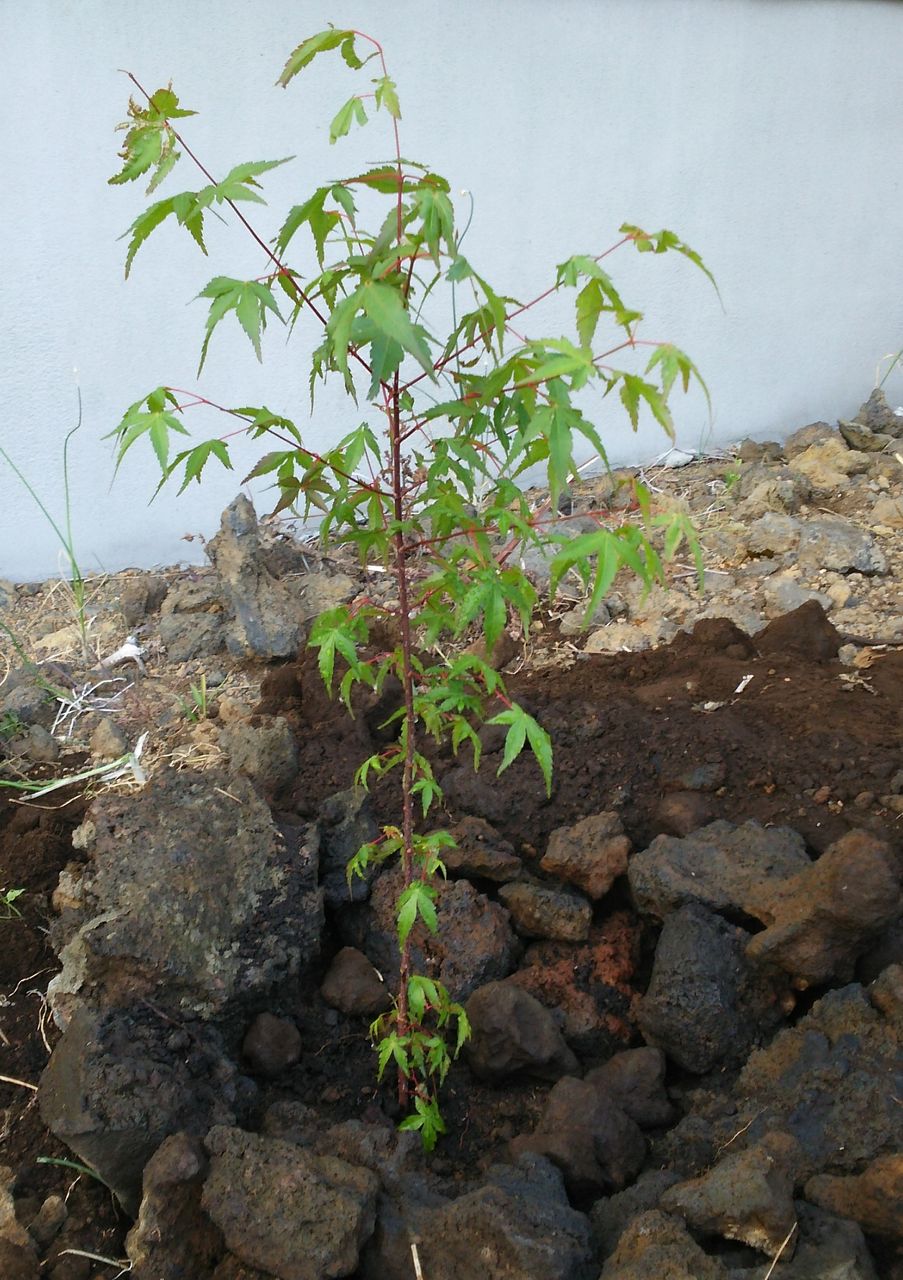 庭の通路にしているところに、自然に もみじ が生えてきましたので場所を移しました。