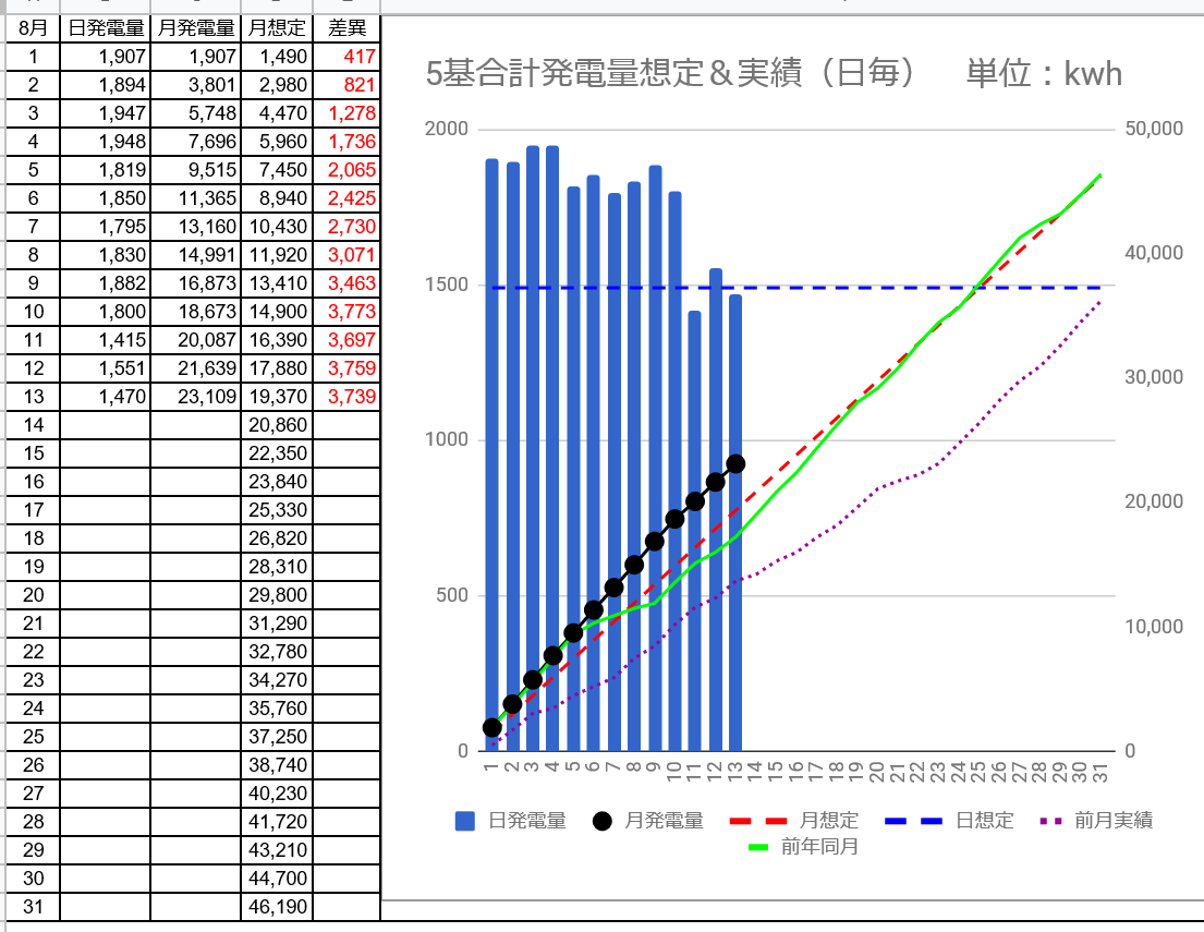 12/16の5基合計の発電量は1,232kWh(日想定差+313Wh)、12/17は336kWh(日想定差-583kWh)でした。パネル1kwあたり1日の発電量は2.00kWhのまま変わりませんでした。