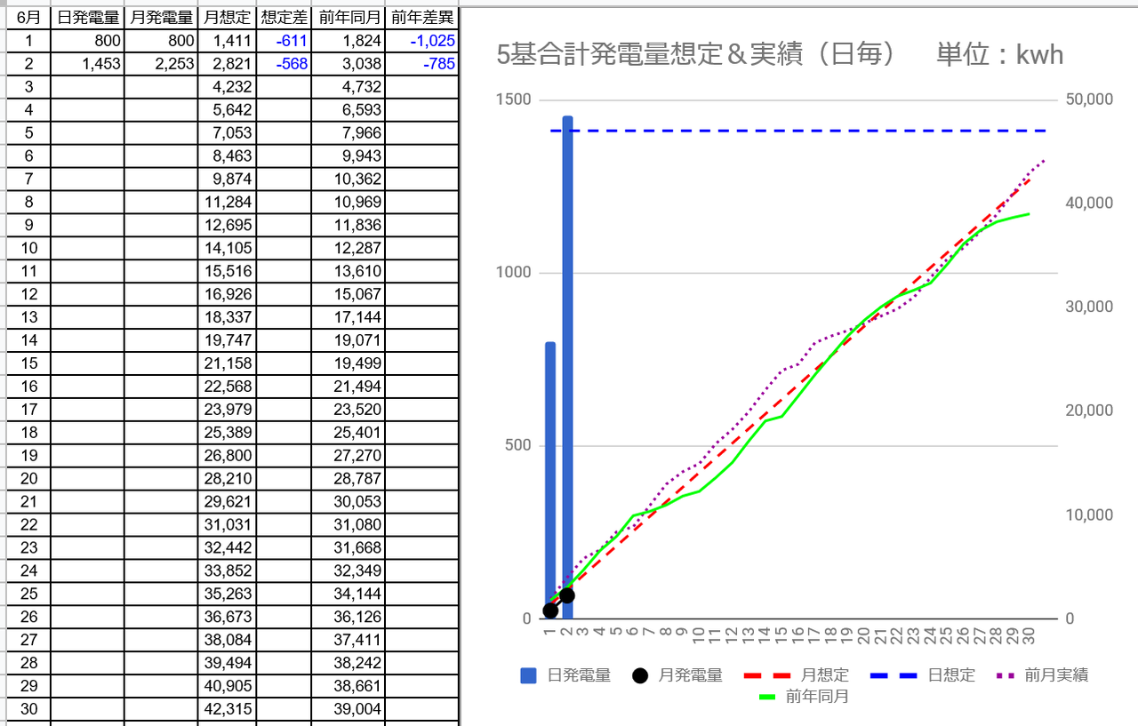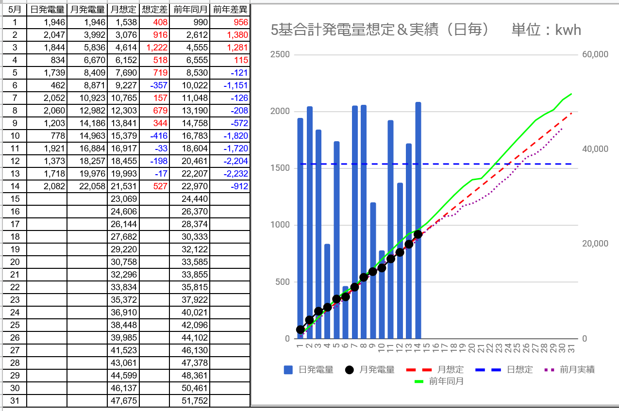 月発電量は35,538kWhで想定差は2/24の+5,822kWhから+5,745kWhに減少しました。