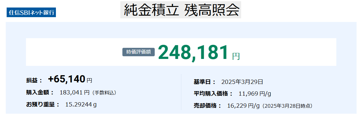 筆者は、住信SBIネット銀行の外貨預金や純金積立等のサービスを利用すると他行宛振込が無料(月10回)になるサービスにつられて2018年10月から純金積立を始めました。