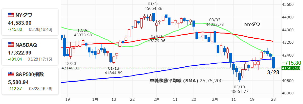 さらに、3/28はNYダウが715ドルも下落するなど米株3指数もそろって下落しました。